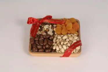 Featuring 12 ounces of plump Turkish Dried Apricots, 8 ounces of California roasted and salted Natural Colossal Pistachios, 14 ounces of irresistible Jumbo Chocolate Covered Raisins, and 11 ounces of our own house blended New Trail Mix. This tray is sure satisfy everyone’s cravings.