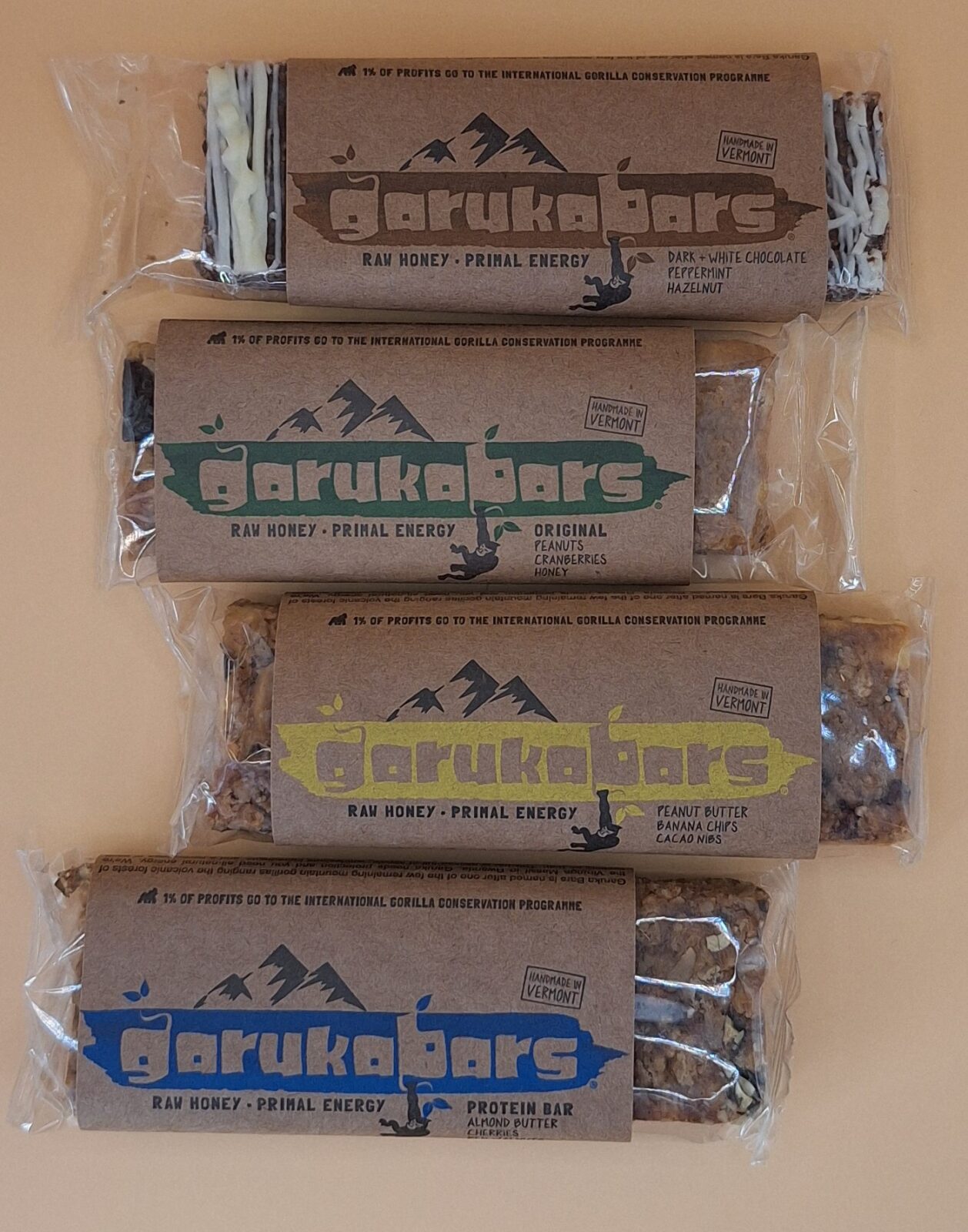 Energy Bars – Garuka Bars are handmade Fresh, with All-Natural Ingredients. Garuka bars are handmade with Vermont raw honey, their packaging is 100% recyclable, and they donate 1% of all profits to mountain gorilla conservation. Wholesome, healthy ingredients like raw honey, roasted peanuts, whole grain flakes, and dried cranberries make for a delicious snack that packs some serious energy.