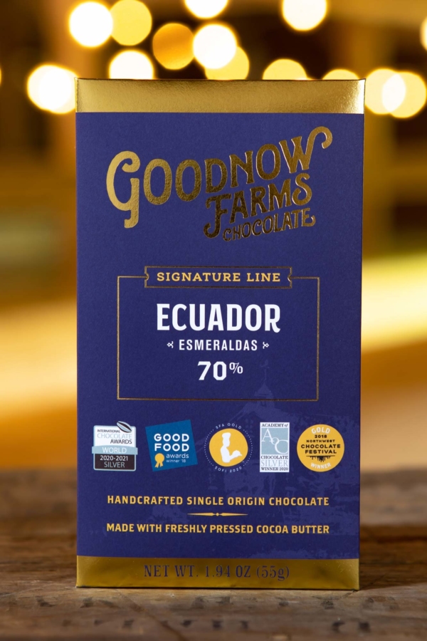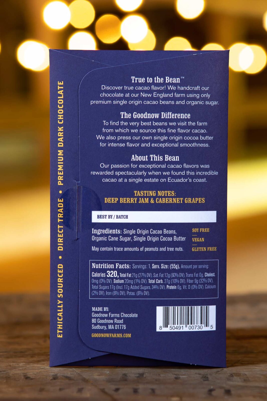 Order Goodnow Farms Esmeraldas 70% Cacao from Arcade Snacks today! An award-winning bar made with beans from the Salazar family farm in the Esmeraldas region of Ecuador. The Salazars have over one hundred acres of carefully cultivated Nacional hybrid cacao trees. The volume of beans they harvest allows them to ferment and dry the beans themselves. And the level of control they have over the cacao varietals they plant, as well as their post harvest processing, results in beans of exceptional quality and flavor. In effect creating a well balanced bar with very low acidity, intense berry jam flavors and a long finish.